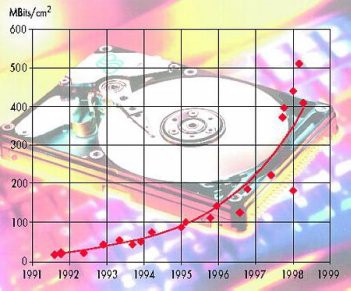 Abbildung: Physikalische Dichte bei Festplatten im Wechsel der Jahre
