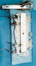 zeigt den ersten IC der Welt, etwa 4 cm lang. Die Abbildung links zeigt