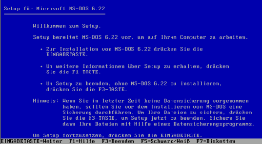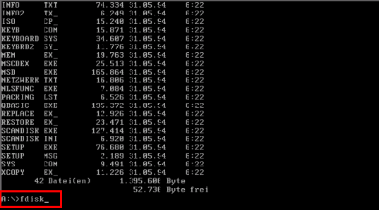Sehen wir uns einmal eine einfache DOS Installation an. Am Beispiel von MS DOS, Version 6.22 verfolgen wir die einzelnen Schritte. Wir booten mit einer Installationsdiskette und starten das Festplatten Partitionierungs-Programm FDISK.
