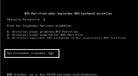Mit diesem Programm richten wir eine Partition auf unserer Festplatte ein. Da dies eine DOS Partition sein soll, wählen wir in der Auswahl den Punkt 1. Erstellen einer DOS-Partition oder eines logischen DOS-Laufwerks.