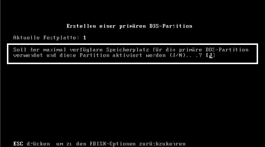 Als nächstes können wir die gesamte Festplatte für DOS auswählen, oder nur einen bestimmten Bereich festlegen. Für unser Beispiel sei eine alte, kleine Festplatte verwendet, daher nehmen wir die gesamte Festpallt.