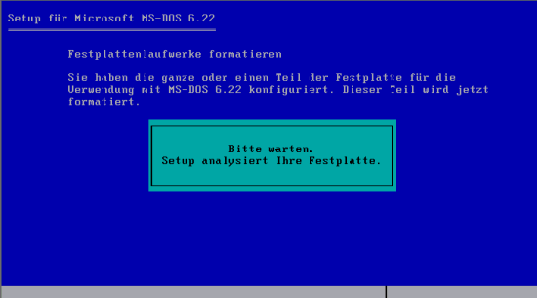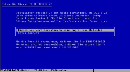 Nach dem Neustart wir das Betriebssystem auf der Bootdiskette geladen, dies erkennt dass die Festplatte noch nicht formatiert ist und bietet diesen Schritt als nächsten an.