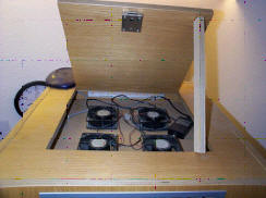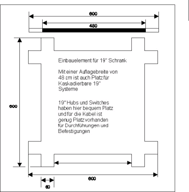 Als zentrale Elemente wurden diese Zwischenböden eingebaut. Sie bieten genug Platz für Kabel und Kühlluft außerdem sind sie stark genug um auch schwere Geräte zu tragen. Die Belastungsgrenze liegt bei 100 kg je Zwischenboden. Da passt sogar ein dicker Server drauf. Mit einer Kantenlänge von 600 mm passen diese Bösen genau in den Schrank. Die ausgesägten Angelpunkte sind je 60 mm stark, damit verbleiben 480 mm als reine Stellfläche, 19" Geräte können hier drauf gelegt oder geschraubt werden. Vorne, seitlich und hinten ist genügend Platz für Kabel und die notwendige Belüftung. Damit können auch USV oder Batterien untergebracht werden. Zusätzlich ist der Schrankboden verstärkt zur Aufnahme der wirklich schweren Geräte. Durch die modulare Bauweise ist eine Erweiterung sehr einfach möglich. |