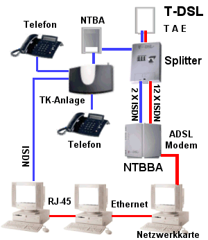 einerseits zum ADSL-Modem und andererseits zum NTBA, an dem eine