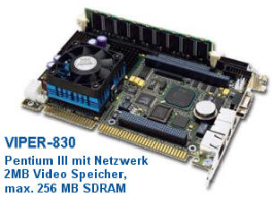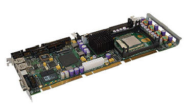 | Für kleine Lösungen gibt es auch so genannte CPU-Karten. Diese sind auf den jeweils gewünschten Bustyp ausgelegt. In diesem Beispiel ist es eine CPU für den Pentium III ausgelegt für den 16bit ISA Bus. Auch heute im Zeitalter von AGP und PCI-Express sind in der Industrie immer noch solche Bustypen im Einsatz. Diese CPU-Karte kann mit einem Pentium III mit 600 MHz bestückt werden, sie verfügt über einen Intel 440 BX Chipsatz, einen SVGA Videospeicher von 2 MB und kann mit bis zu 256 MB SDRAM, optional gar registriertem SDRAM (RSDRAM) bestückt werden. Selbstverständlich ist auf Wunsch auch ein 10/100Base-TX Ethernet Anschluss verfügbar. Mit 256 KB L2 Pipeline Burst Cache ausgerüstet kann diese Karte für viele Zwecke eingesetzt werden. |